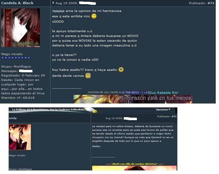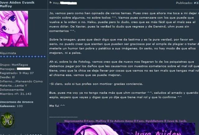 Cosa que me esta molestando muchísimo últimamente son sus roles camuflajeados, ellos dicen que de nuestra parte también hay pero honestamente he leido nada más de ellos. Claro ejemplo un rol que hizo Kium sobre Sagitas sobre "una puerca que se revuelca en sus heces"... por Dios! Eso no es rol ni de chiste, se esconden para ofender y que poco valor. Es decir, les dejé dos claros ejemplos de como burlarse del otro bando con CALIDAD y de manera RESPETUOSA, sin tener post "camuflajeados".