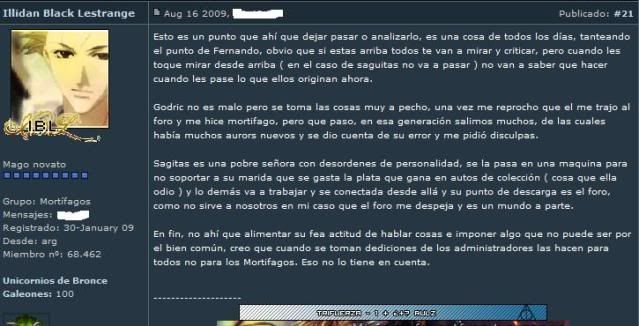 Meterse con una persona detrás del juego es comenzar a olvidar la diferencia que existe entre "juego" y "realidad". Nosotros no la empezamos, evidentemente. Reto a cualquiera a que me muestre un solo posteo donde los Aurores nos hayamos de pasado de la raya dentro de la Orden.